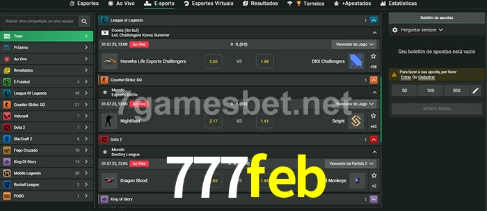 O 777feb oferece uma grande seleção de opções de apostas em e-sports com probabilidades competitivas